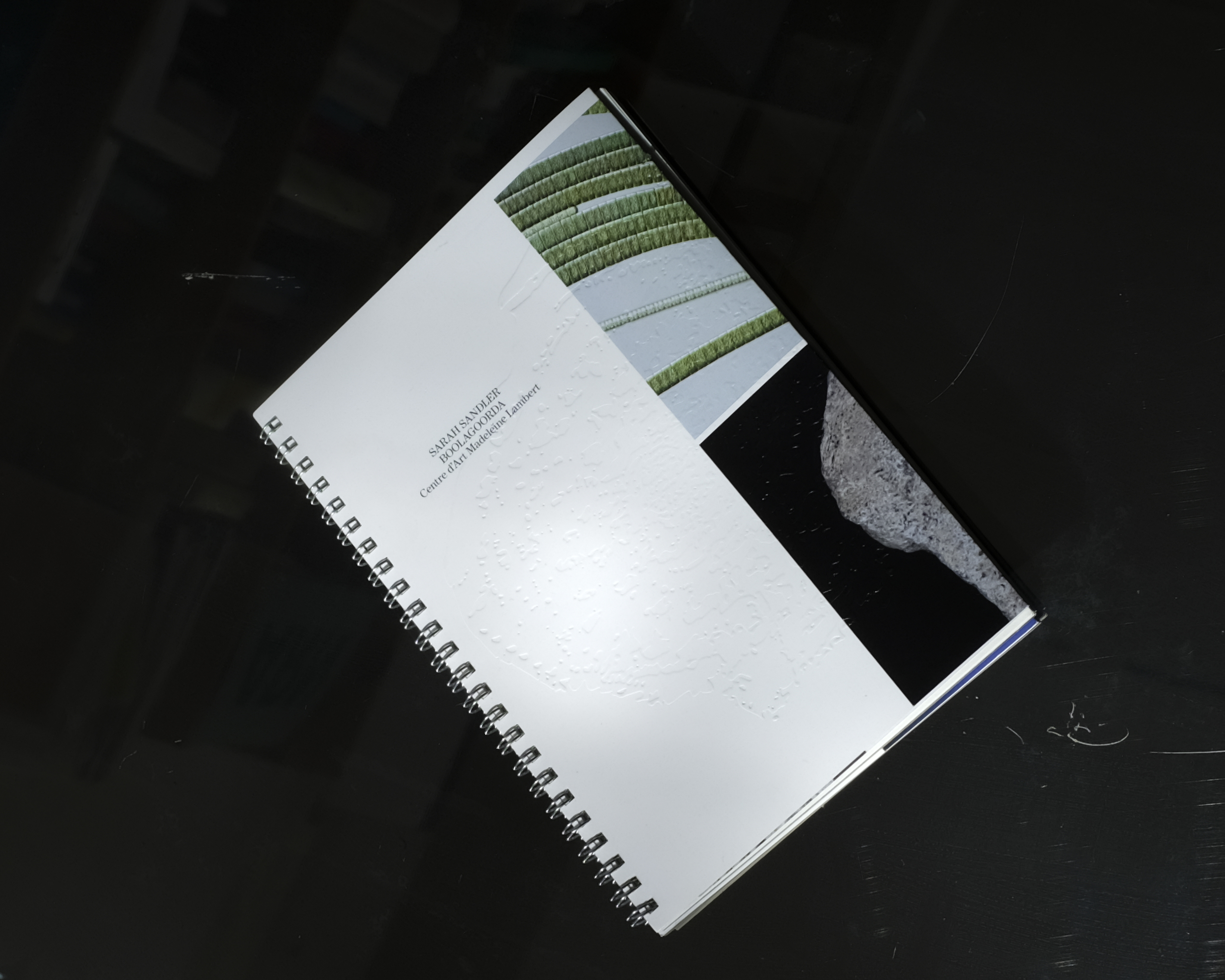 Design graphique pour Boolagoorda, catalogue de l'exposition éponyme de Sarah Sandler au Centre d'art Madeleine Lambert. Réalisé sous la direction éditoriale de Xavier Jullien, directeur du Centre d'art.